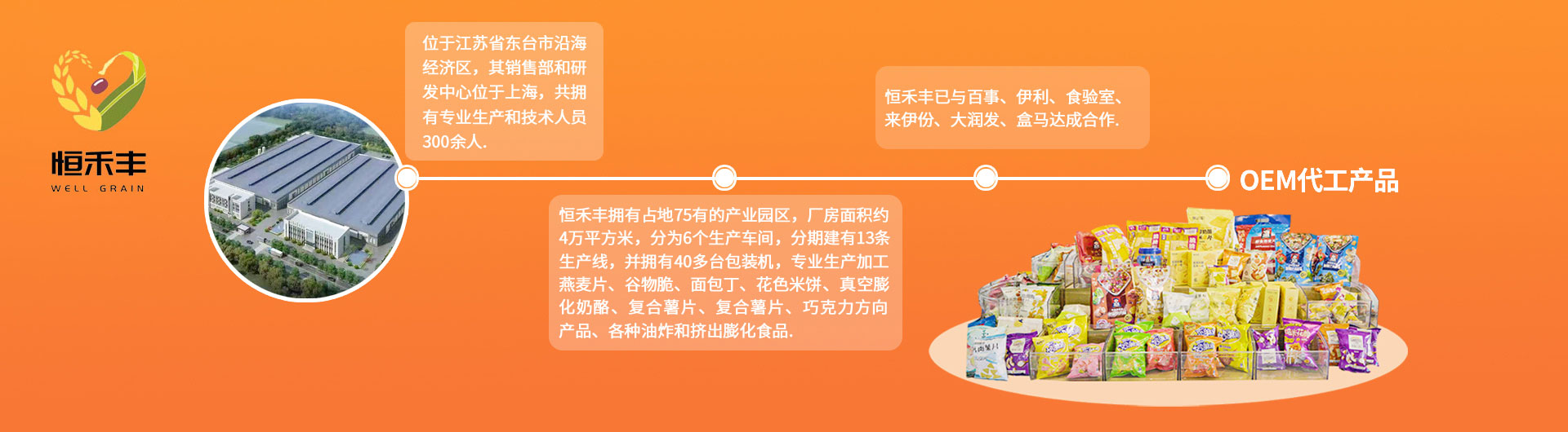 目前,恒禾豐擁有占地75畝的產業園區,廠房面積約4萬平方米,分為6個生產車間,分期建有13條生產線,并擁有40多臺包裝機,專業生產加工燕麥片、谷物脆、面包丁、花色米餅、低溫真空膨化奶酪及果蔬、各種油炸和擠出膨化食品。